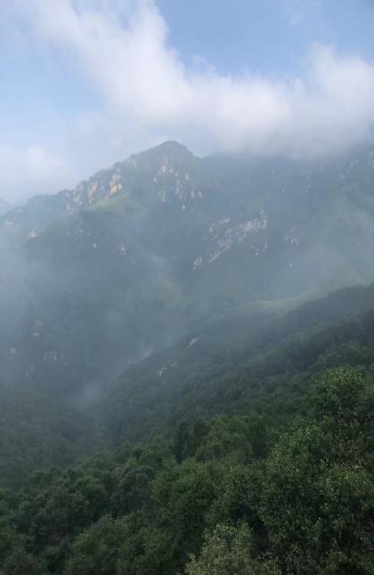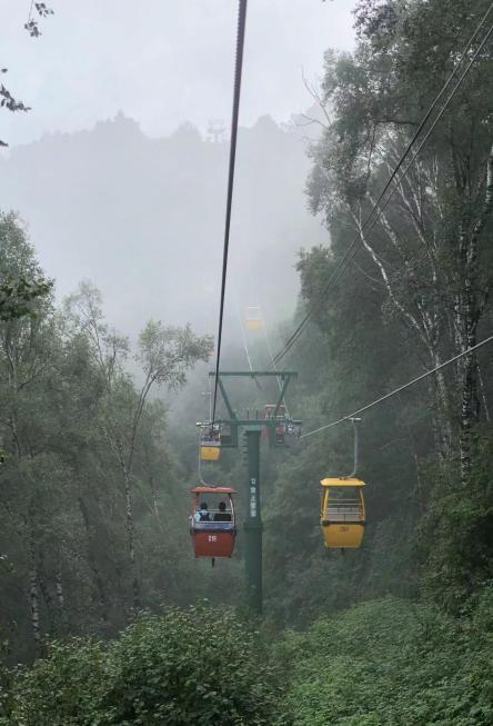 第二天行程安排就是攻上駝峰,駝梁因山頂兩峰此起彼伏,形如駱駝峰脊而得,駝峰就是最高處,我們早上7點到達山腳,開始爬山,清晨山中環境清幽,云霧繚繞,我們沿著蜿蜒山路,到達了纜車處,為了保存體力,我們選擇的乘坐單程上山的纜車,和別處的纜車不同,駝梁山的纜車是跨過一座山峰,到山腳下,再爬駝梁主峰。纜車是框架的,沒有玻璃,可以清楚的近距離觀賞漫山的林木,那種美景,單純爬上去是看不到的。