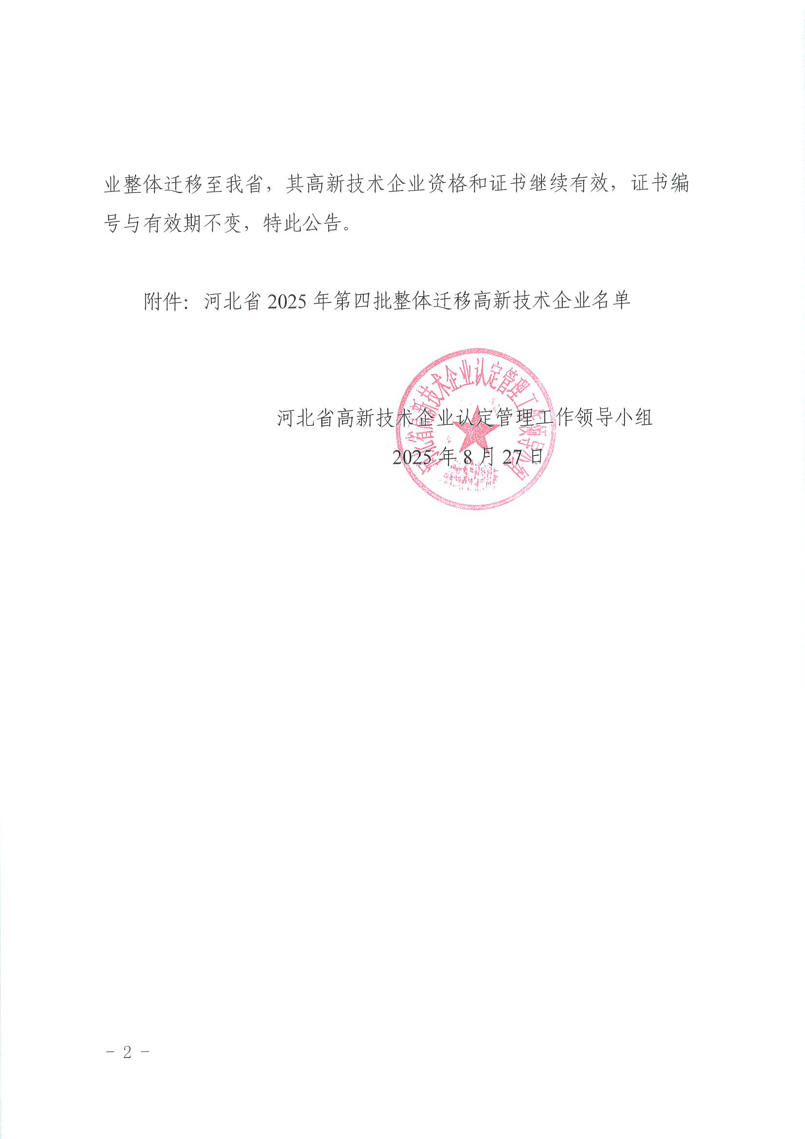 關于公布河北省2025年第三批更名及重大變化高新技術企業的通知